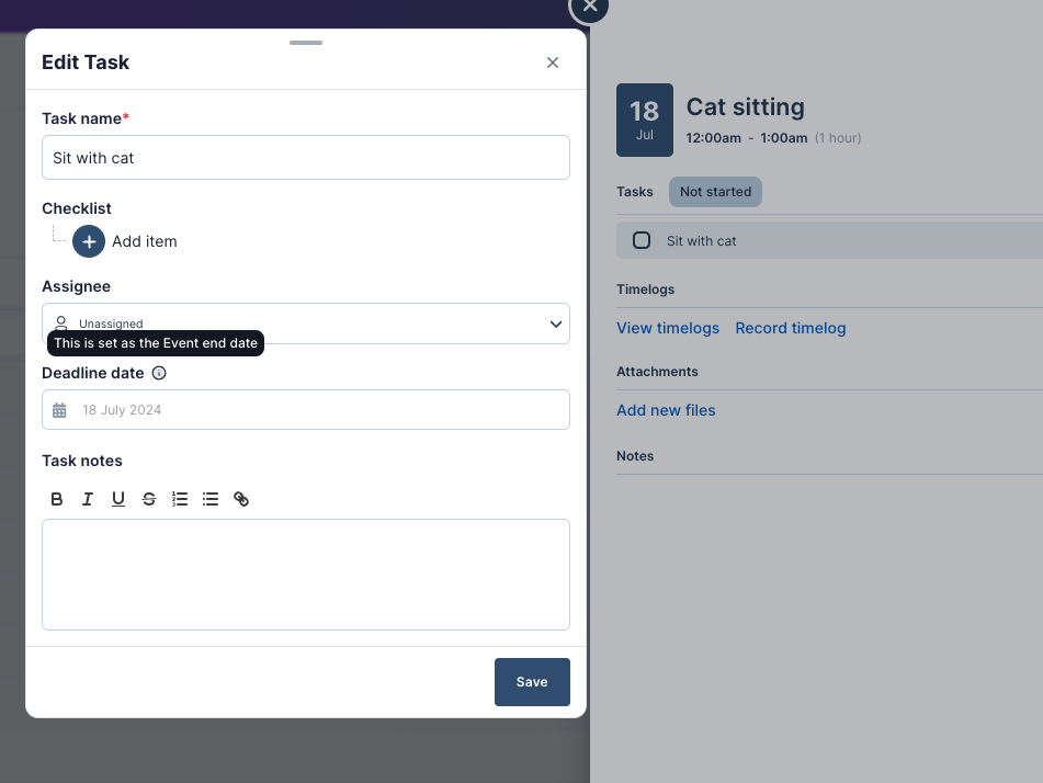 Tasks associated with an Event will automatically have their deadline set to the Event's end date. This deadline will dynamically update whenever the Event's end date is changed, ensuring that your task timelines are always accurate and up-to-date.