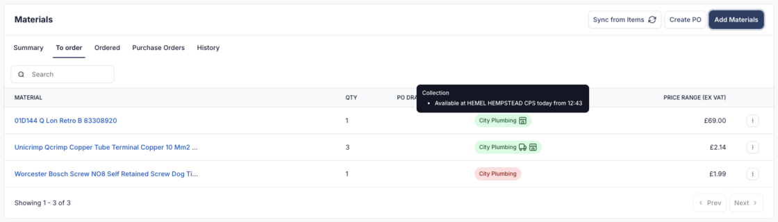 When viewing your City Plumbing Materials to order on a Project, you’ll now see a live availability badge. This badge gives you real-time information on: