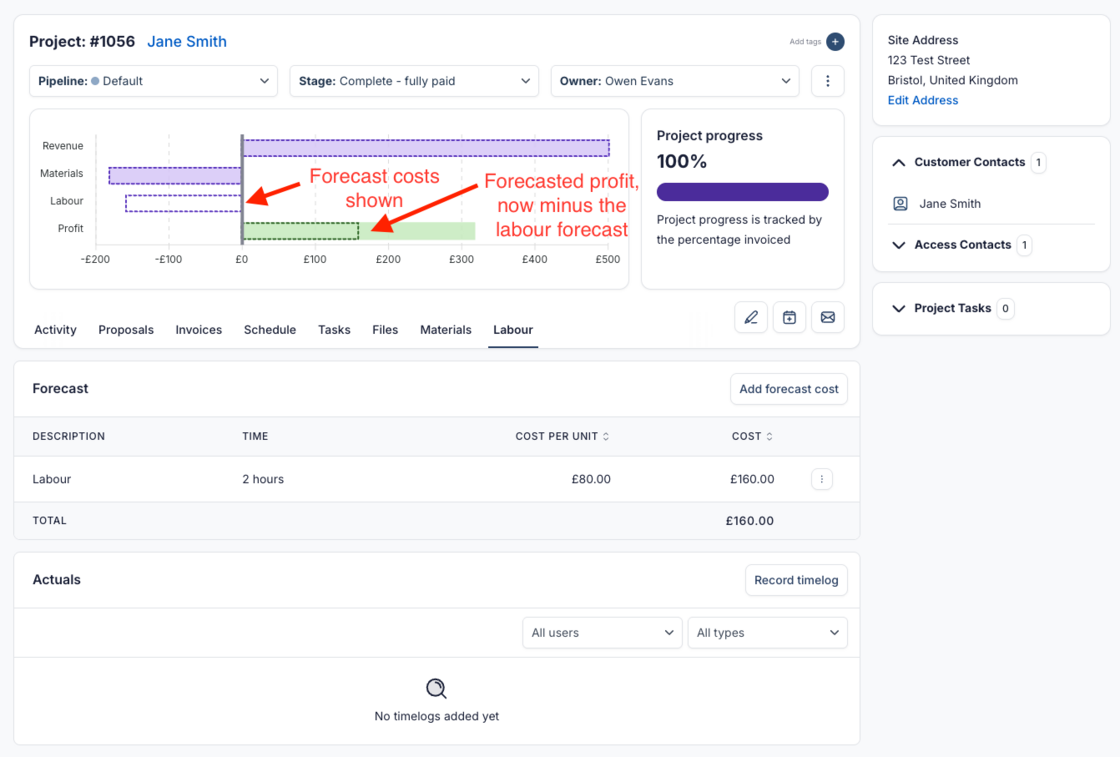 In this tab, you can now track the forecast cost of a project too. This forecast is measured against your Timelogs, displayed in the Project Profitability graph.