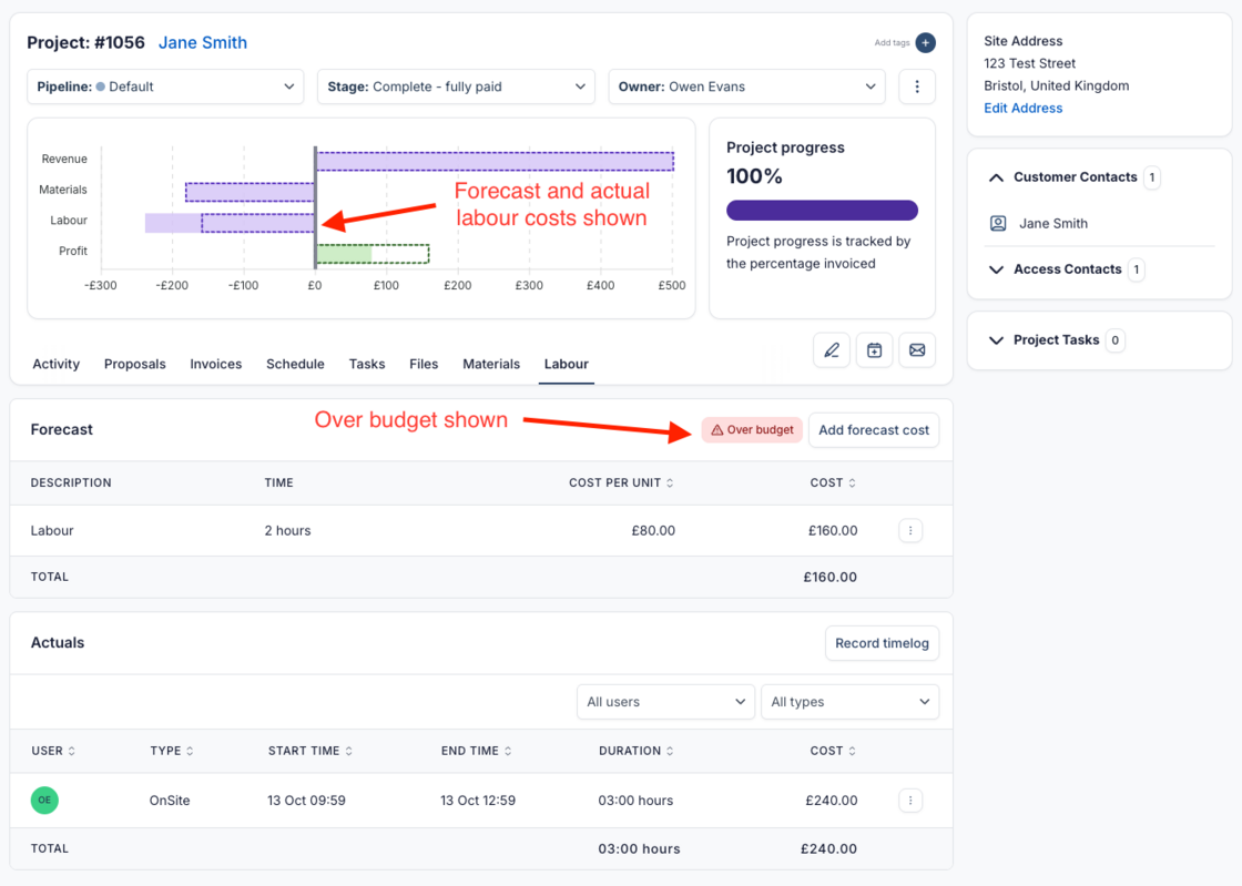 If a project goes over budget, it will be clearly flagged in the Labour tab.